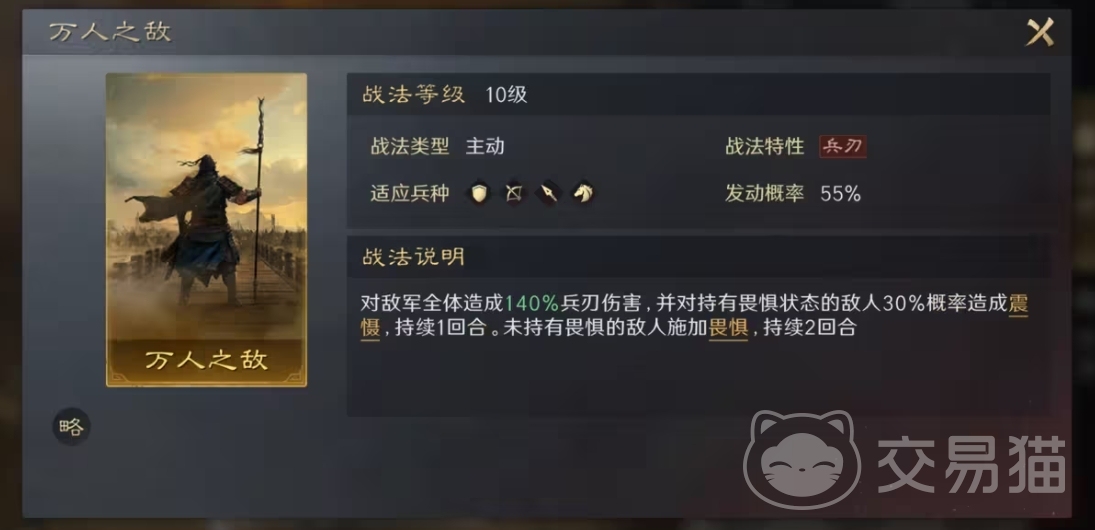 三国谋定天下这款手游里面的张飞也很强劲,作为蜀国阵营的橙级武将,同样选择枪兵是最好的,它的万人之敌战法属于主动发动的战法类型,AOE的范围伤害可以给敌方军队带来140%的暴击伤害,甚至有30%的概率给敌军施加畏惧效果,这个效果持续两回合。