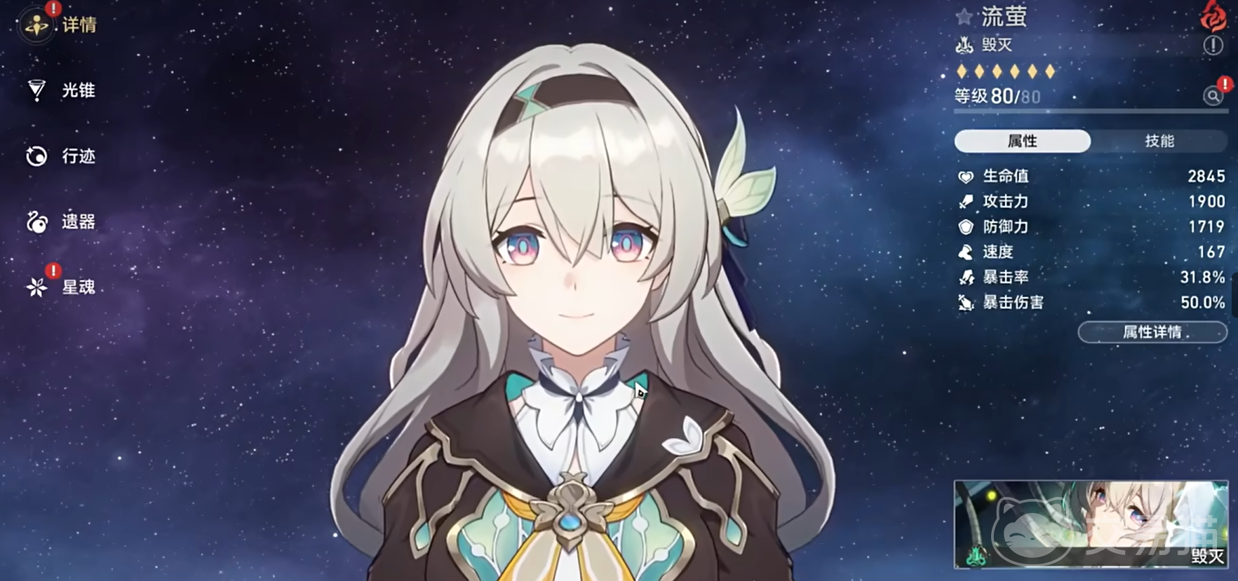 作为毁灭命途角色流萤拥有非常高的基础攻击力,但是流萤作为全新击破体系的输出角色流萤的出伤方式主要靠弱点击破之后的超击破输出,所以在流萤的行迹中升级所提升的数值也都是击破特攻。