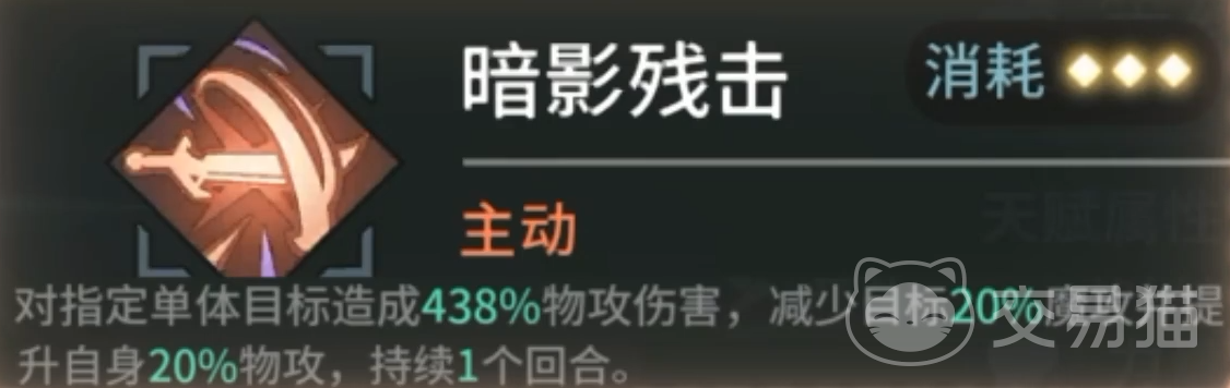 根据他的基础属性,我们便可以看到其物理攻击以及血量都是非常高的,同时还自带一定的暴击。剑魔的第一个技能名为黑暗汲取,其消耗为1点,可以随机对敌方的两个单位造成101%的伤害。提升之后会增加技能的伤害值。总的来说是一个不错的基础技。二技能暗影残击是一个三费技,同时也是一个单体技,可以对指定的单位造成438%的伤害,会减少目标20%的魔攻,并同时提升自身物攻,这个效果会持续1个回合。