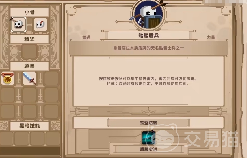 头骨先选择上推荐大家选择“骷髅盾兵”和“骷髅-剑”的搭配,这两个一个是力量型头骨,一个是平衡型头骨,可以起到互补的作用,而且他们打的都是物理伤害,因此在搭配装备的时候也不会有冲突,而且他们自带的特性和技能都很厉害,盾兵可以蓄力冲刺,伤害敌人的同时还能拦截他们的攻击。