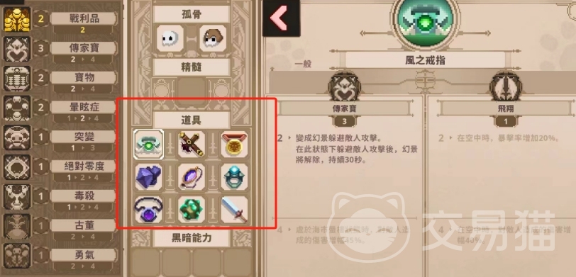 道具则推荐使用“风之戒指+老旧十字架+卡利恩军衔+褪色的魔石碎片+魔法的黑暗宝珠+被遗弃的结婚戒指+剧毒吊坠+发光石+补给型卡利恩剑”的搭配,这一套可以点亮2战利品+2传家宝+2宝物+2晕眩症+1突袭+1绝对零度+1毒杀的刻印组合,分别提供更多的攻击力,更强的躲避能力,更高的宝物发现率,以及眩晕敌人,冷却缩减,冰冻敌人和给敌人挂毒的效果。
