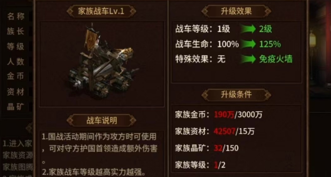 家族还拥有独特的家族战车,这是为国战精心准备的道具。在国战中,作为攻击方,家族战车能对敌方的护国首领造成额外的伤害。战车的等级越高,其威力就越大。对于实力较弱的玩家来说,使用家族战车既能在国战中发挥作用,又能避免被敌人迅速击败,这无疑是一个极好的策略。