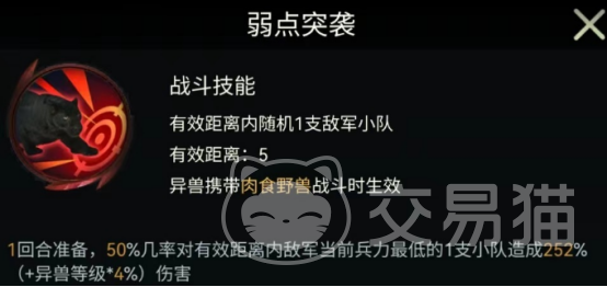 豹子拥有较快的奔跑能力,游戏当中的黑豹也非常符合现实生活中豹子的整体性能,有着灵敏矫健的身姿,被称之为全能冠军,可以战斗也可以指挥。战斗技能弱点突袭对敌方造成严重的伤害,指挥技能冷血猎手也有超强的作用。