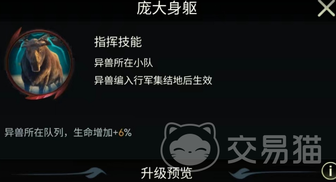 巨角冲撞这是一个纯伤害输出技能,有效距离为两格。在满级时,巨驼鹿有40%的几率随机伤害一支敌军小队,不附带其他额外效果。作为异兽头领,巨驼鹿还具备一定的加成效果。由于其通用性,它可以与任何野兽搭配,激活相应的效果。它还拥有独特的“庞大身躯”技能,能为所在队列提供额外的25%生命值加成。这一技能在前期开荒或艰难战斗中尤为实用,能有效减少战斗消耗。