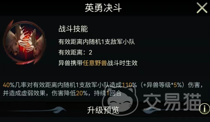 首先是英勇决斗,该技能的有效距离为两格。在这个范围内,巨驼鹿会随机选择一只敌军小队,并有40%的几率对其发动攻击,造成虚弱效果。一旦敌军被成功削弱,其在接下来的一回合内输出伤害将降低20%,这对敌方的攻击力构成了显著限制。