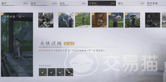 但这一个瞭望塔在操作时还有一些复杂,因为这里没有梯子,玩家就需要动用自己的小脑筋。在爬上瞭望塔之后就可以去拾取证字小木牌,接着又可以重新的找到蓉蓉,把刚刚获取的几个木牌交给蓉蓉,一旦再交给蓉蓉之后,则意味着马上完成大侠试炼任务。