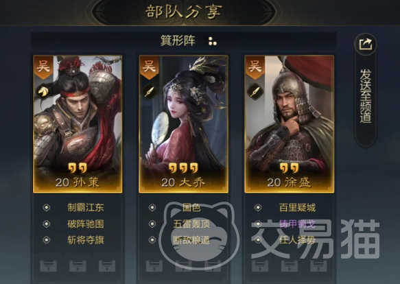 这是另外一个阵容搭配,阵容中的每一个角色在获取时没有太多的难度,就算是新手玩家也并不需要过于担心,可以直接作用于开荒。无论是孙策还是徐盛,都拥有很不错的伤害强度,在合理搭配之后可以体现出整个队伍的实力。另外在队伍中还特意搭配大乔,这是一个辅助性的角色,出现在队伍中,可以给整个角色带来属性增益效果,让无数的玩家都会喜欢上这一次的阵容。