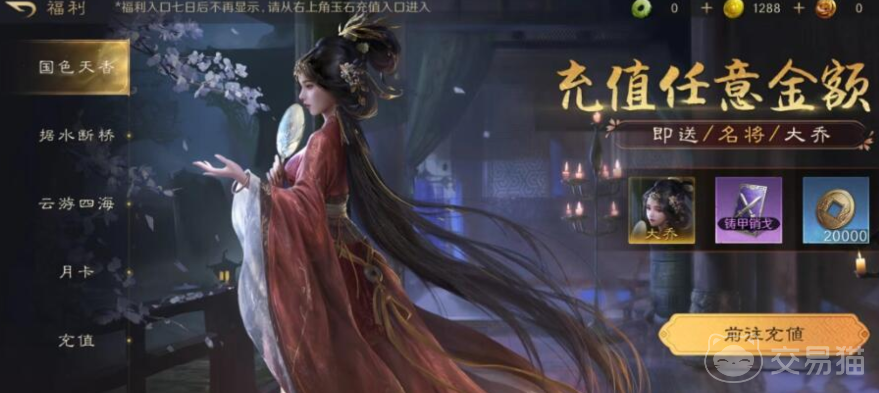 在该游戏当中,月卡其实涉及为两种。一种是18元,还有一种是30元,目前很多玩家会选择购买30元的月卡。毕竟涉及到的金额不一样,性价比也会有所不同。一般玩家购买了月卡之后就会获得玉石和黄金,除此以外,玩家还会获得开荒武将大乔。