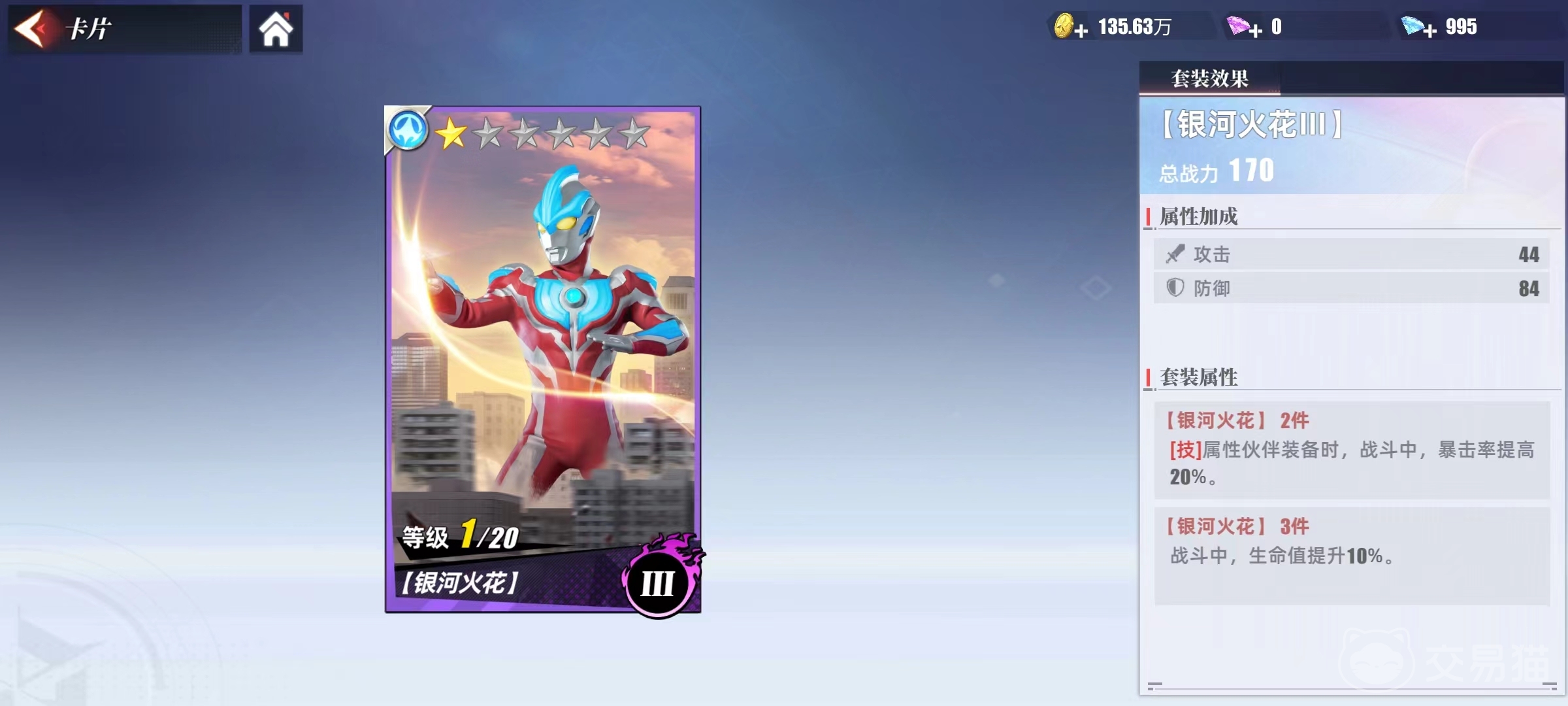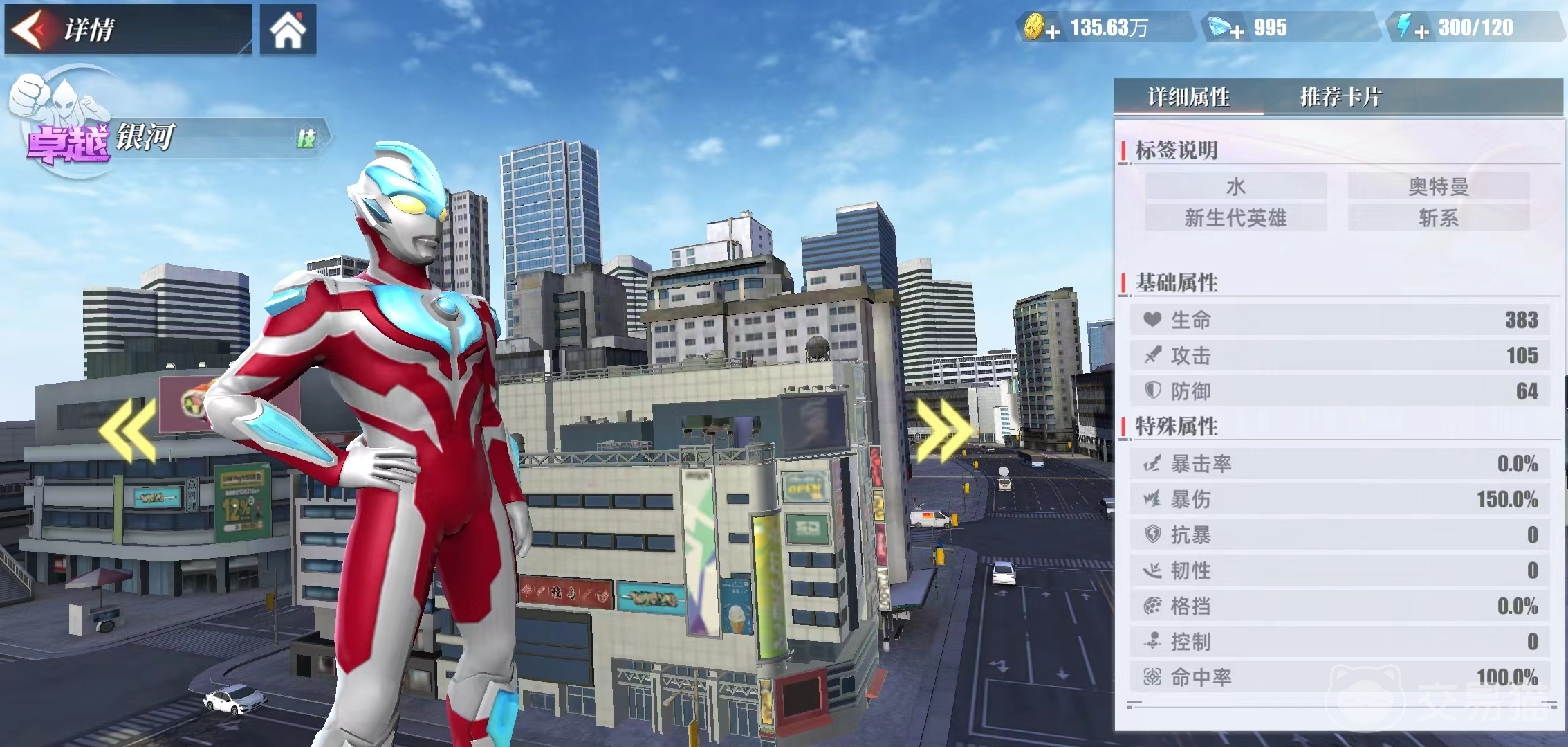 在游戏中,银河属于技巧型的奥特曼。比较推荐的卡片有银河火花,三件套带来生命值加成和暴击率提高。还有第七人效果,用于提高暴击力和生命值。在格斗中最关键的当然是普攻效果,是很多连招的基础和开始,银河的普攻一共有5段效果,最后一段可以直接将人物击飞。接下来选择就比较多了,可以直接使用自身技能银河光剑,接下来接上银河火焰球,给对方造成极大杀伤。