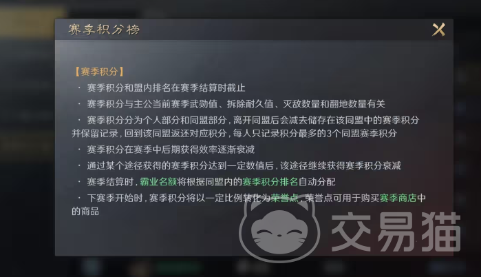 个人赛季积分是影响玩家在同盟内的积分排名,玩家的赛季积分排名高就越能够获得同盟的霸业名额。这里和小伙伴们打个比方,如果玩家的个人赛季积分在同盟积分中排名前50,而刚好本次同盟霸业名额有50个,那么玩家就能够获取到同盟霸业的名额。