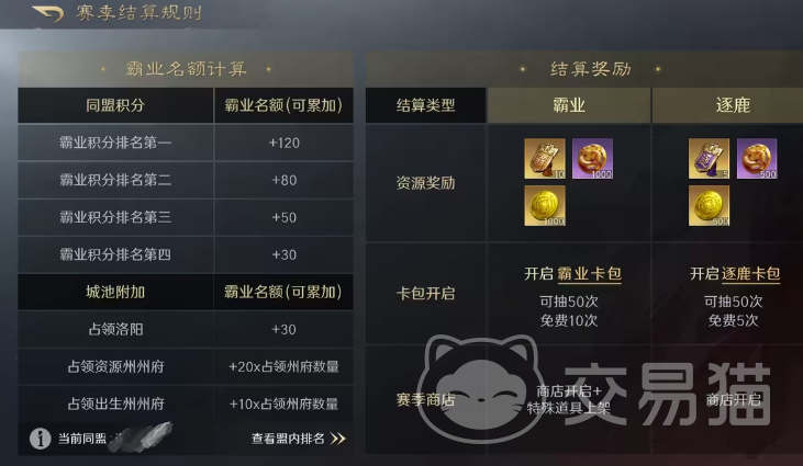 这里首先要提醒大家的是在同盟中拥有官职的成员是不能够分享同盟霸业名额的,获得霸业名额的成员能够获得霸业结算的奖励如果没有获取的玩家也能获得逐鹿卡包。个人排名玩家也可以拿到霸业名额。