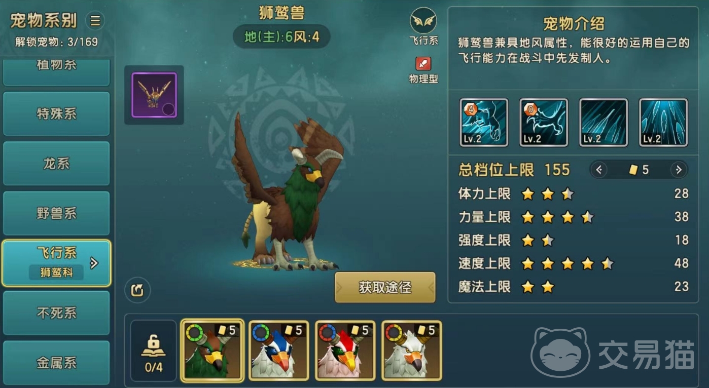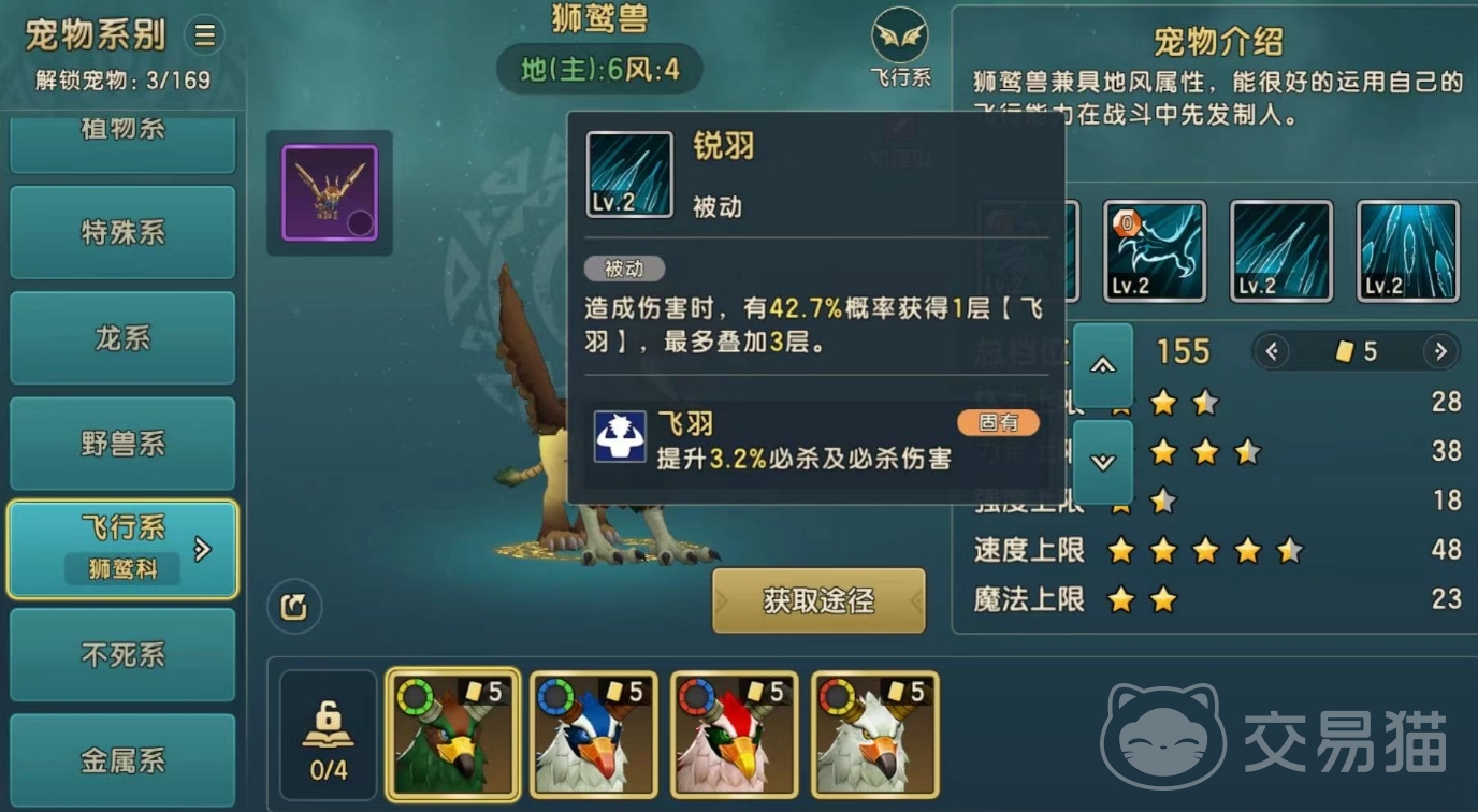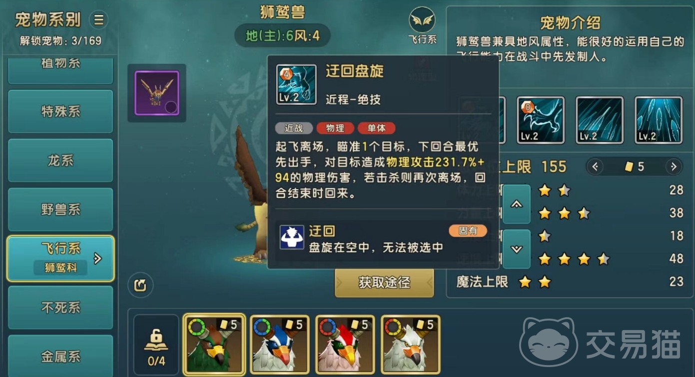狮鹫在游戏内属于飞行系的宠物,拥有一对翅膀,可以更好的飞到空中,给敌人带来毁灭性打击,拥有先发制人的能力,它的速度非常的快,高达48点,在游戏内属于领先位置了,这个宠物一共拥有四个技能。首先,第一个技能为迂回盘旋,这个技能是一个近程技能,可以直接飞到空中,瞄准敌方一个目标。在下回合最优先出手,对目标造成物理伤害231.7%,并且还会拥有无法选中的效果。