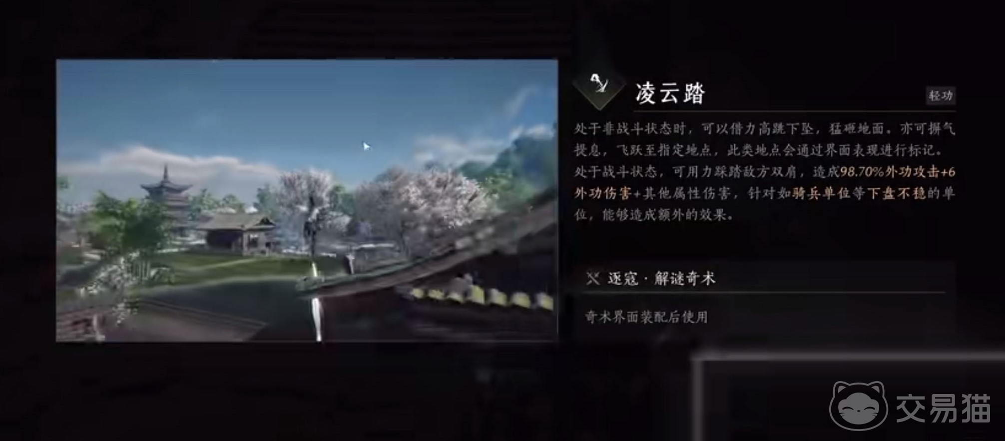 上述就是燕云十六声凌云踏怎么获得的内容分享,想要获得这项奇术的话按照小编分享的步骤就能轻松获得,而且这个奇术兼具了轻功飞跃和攻击的功能,算是一个很值得拥有的奇术。