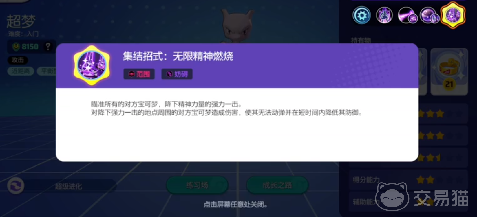 3、小技能:念力(使对方宝可梦造成伤害并击退),屏障(短时间内获得护盾并提高移速),它的两个小技能都非常的弱,这使得5级前的超梦几乎没有什么作战能力。