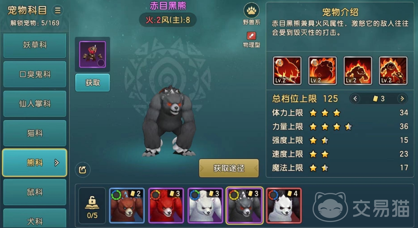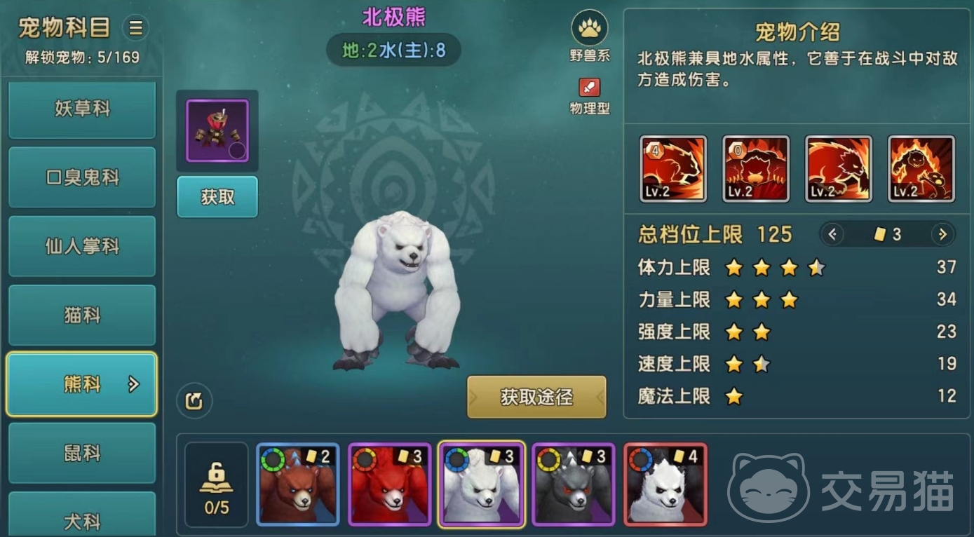 目前游戏内现有的熊科宠物一共有5个,分别是穴熊、赤熊、北极熊、赤目黑熊以及猫熊,这些宠物的实力都会有所不同,首先穴熊它是兼具地水属性,能够在战斗中对敌方造成强大的攻击伤害,体力和力量上限较高。