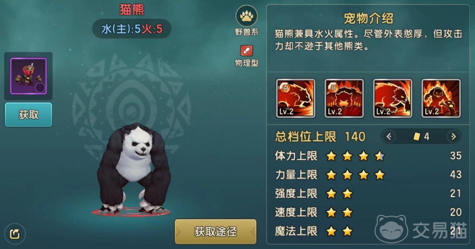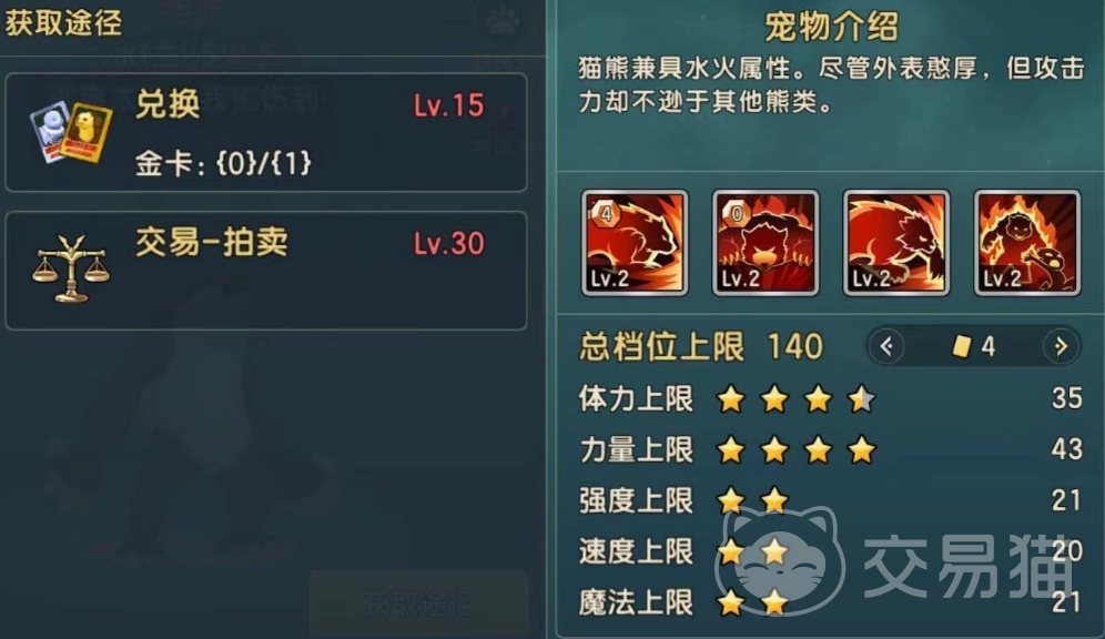 最后一个就是猫熊,这个宠物具备水火属性,虽然外表憨厚,但是攻击力非常的强悍,也是目前游戏里为数不多的红色品质宠物,体力上限和力量上限都是非常优秀的,总档位上限高达140。