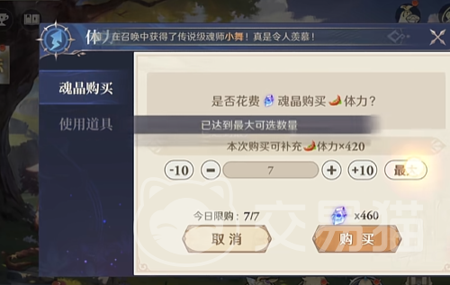 第二个获得体力的方法就是通过购买体力的方式来进行兑换,需要玩家们花费魂晶来进行购买,不过每天只能购买七次,一共需要花费460哥魂晶来进行兑换420点体力值!目前游戏中只有这两种不同的体力获得方式!