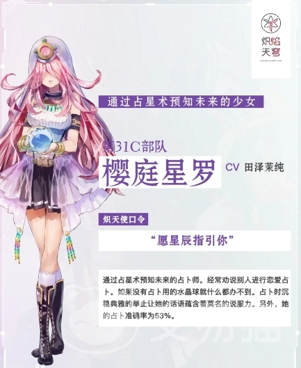 樱庭星罗是一名占卜师,拥有粉紫色的头发,身高171厘米,星座为巨蟹座,定位是一个输出角色,主要属性是攻击属性。她的技能效果在不同等级和品质下有所不同。在A级到SS级别,樱庭星罗的属性都是攻击属性。到了SS级别以上,她的攻击属性会增加冰元素伤害,使其成为冰打属性。这种转变使她在战斗中具有更强的多样性和适应性。基础技能可以回复能量,被动技能能够增加15%的攻击力。