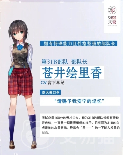 苍井绘里香是《炽焰天穹》中备受瞩目的明星角色,基础属性包括攻击力、防御力和生命值等,这些属性使得她在战斗中具有较高的生存能力和输出能力。群攻能力强大,尽管在战斗中表现得非常出色,内心深处却带有一定的自卑感。擅长打击属性攻击,技能能够发射能量弹并回复自身能量,被动技能则能提升她的攻击力和防御力。
