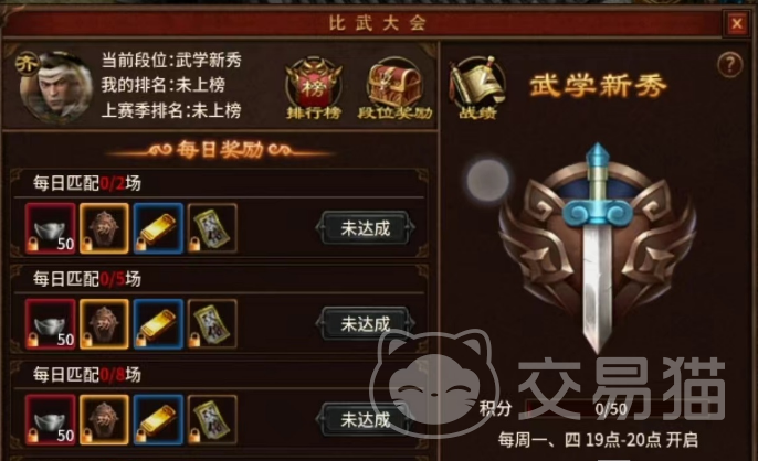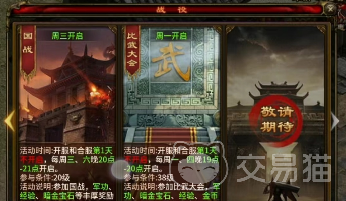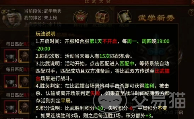 比武大会并不是每天都有的,它会在每周的周一和周四晚上七点到八点这段时间内开放。如果玩家是新进入游戏的玩家,或者是服务器刚刚合并,那么第一天可能就不会有这个活动,这点大家要留意一下。只要玩家的等级达到了38级,就可以报名参加这个比武大会了。无论玩家是输是赢,都能获得一些奖励,当然,名次越高,奖励就越丰厚。