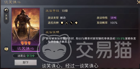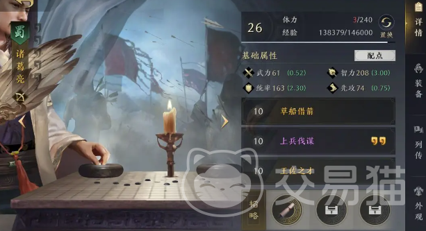 在整个队伍中,诸葛亮本身就是主c的存在,在每一次攻击或者是被攻击时都会有50%的机会,针对地方造成谋略伤害。在必要时可以使用空城计,另外还可以使用断敌粮道,还有上兵伐谋。别忘记要将黄月英放在后方,可以带来辅助效果,给诸葛亮打造出良好的输出环境,能避免后期的隐患。