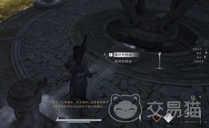 玩家们在月隐山山顶跳下悬崖来到隐藏地道后,先救出被困住的NPC,便可开启太极之谜。这个谜题主要有一个转盘和四个可转动的龙头组成,其中转盘处有两个圆形的图案,它们所对准的龙头若是发生转动,另一个也会跟着转,而龙头喷出雾气的方向为正方向,这些在等下的解密中都会用到,还望玩家们能牢记。