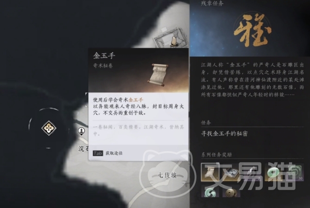 帮严奇人解开穴道后,金玉手的学习任务到此也就全部完成了,而玩家也能直接获得本次任务的报酬——奇术金玉手。玩家们可选择继续与严奇人对话,了解他身上的一些故事,也可直接离去。此外,学会金玉手后可直接装备使用,无需再去完成额外的条件。