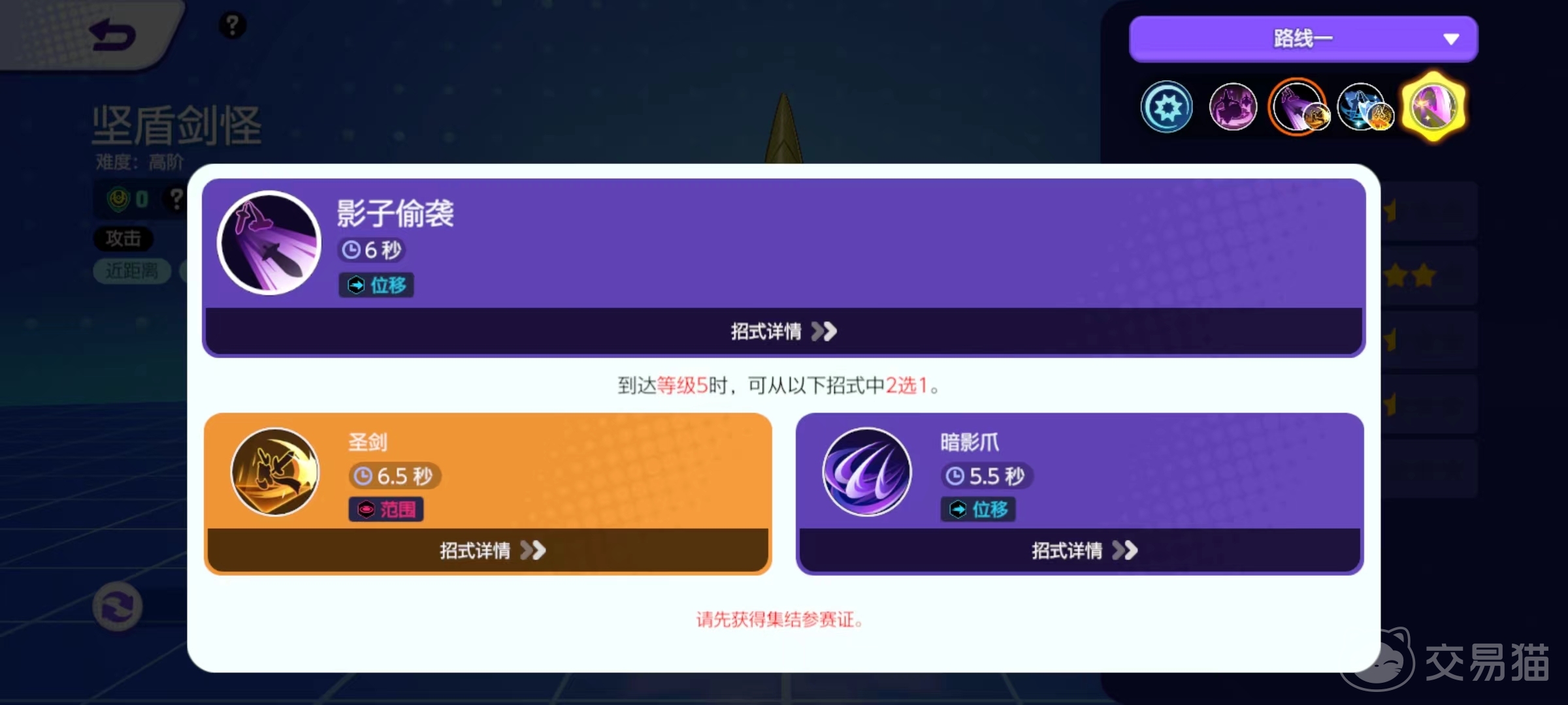 当角色等级达到5级时,可以将第1个招式进化为更高级类型,需要大家在圣剑和暗影爪中选择一个。圣剑范围输出能力出色,使用时可以累积进度条,伤害数量越多,累积进度条也就越高。暗影爪爪属于连续攻击加位移效果的技能,指定方向连续攻击,三次攻击只要命中一次,都会累积进度条。
