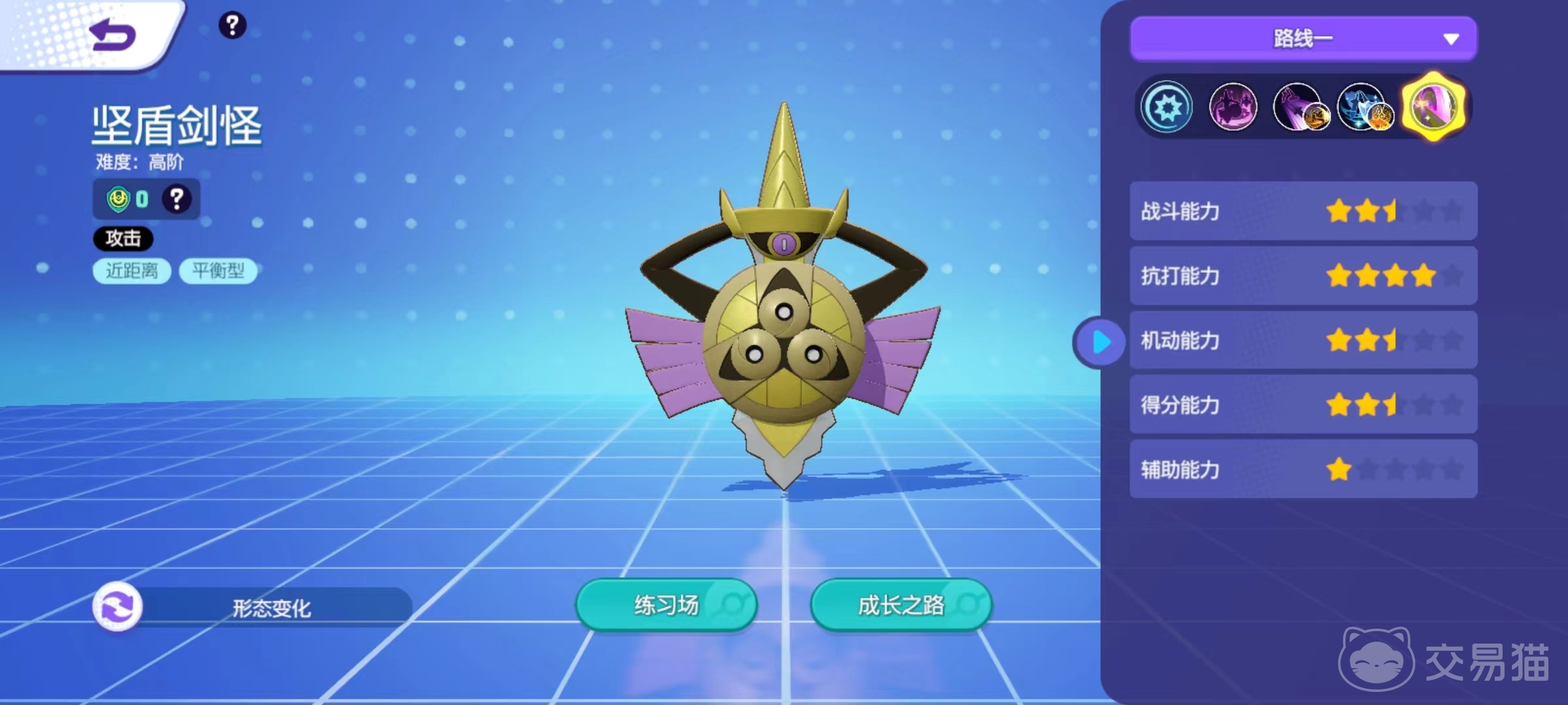 坚盾剑怪在两种形态下属性有着很大的差异,两种形态分别是刀剑和盾牌,刀剑形态下移动速度和攻击提升,普攻间隔很短,盾牌则是防御和特防提升。除了属性方面的差异之外,这两种形态还影响后续招式的使用。当然在大招方面是一样的,都是指定方向后发动,对方血量越低伤害就越高,打倒后还会累积进度条。