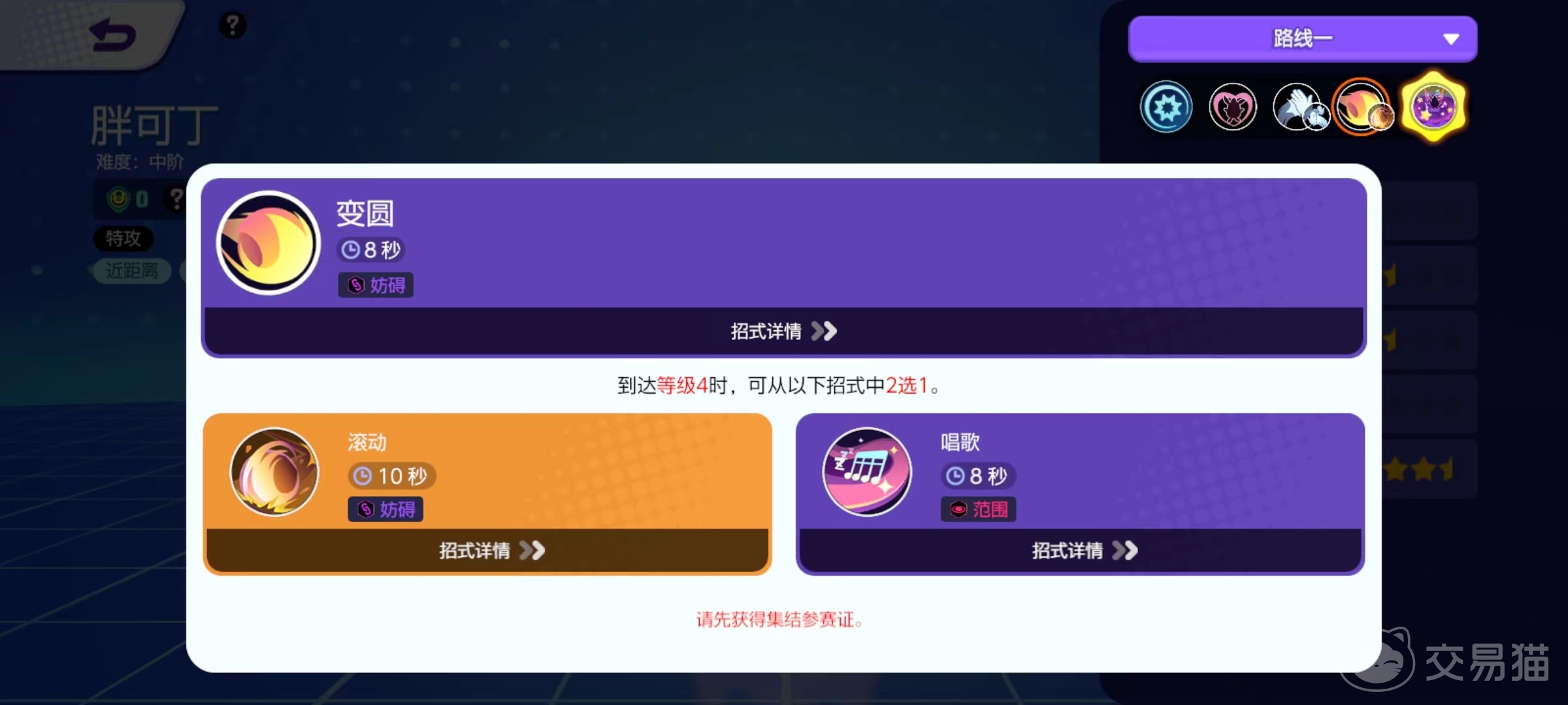 第2个变圆,快速滚动,将接触到的目标击飞,自身获得护盾,如果滚动时遇到障碍物,会将其他招式冷却时间解除。达到四级时在滚动和唱歌间选择一个,滚动效果和变圆非常相似,唱歌属于利用歌声降低对方移动速度,还会陷入睡眠状态降低防御,胖可丁使用该招式时自身还有机动速度的加成。这两个招式的选择,小编当然倾向于唱歌,毕竟这属于胖可丁专属招式,减速和睡眠都很有效。