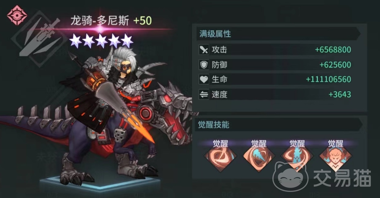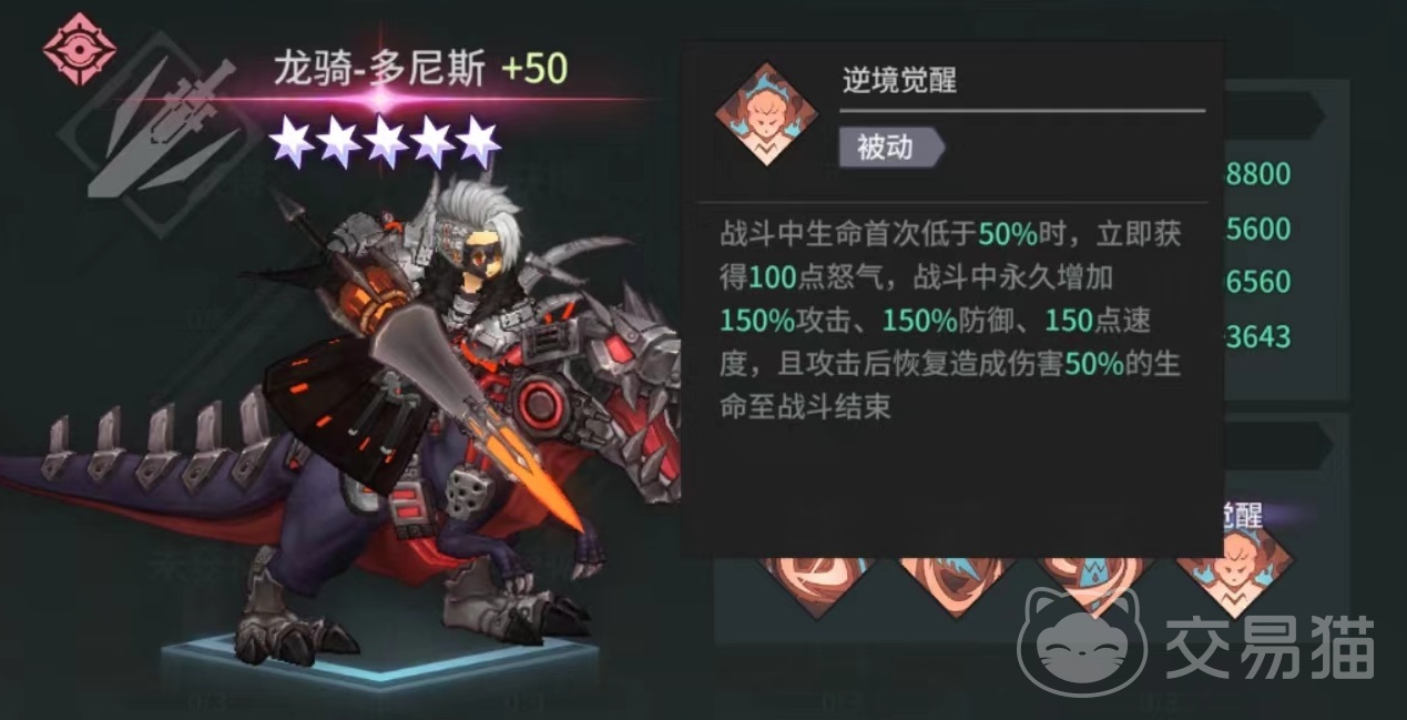 龙骑士多尼斯手持巨大骑枪,骑乘机械霸王龙,在外观方面极为霸气。他拥有三个被动技能和一个主动技能。主动技能破血狂澜,随机选择三名敌方单位造成伤害,并使目标进入到流血状态。每回合会根据自身攻击比例造成持续性输出,在计算伤害时,目标防御也会参与进来,每回合额外造成90%伤害,持续三个回合。该技能使用之后,自身还能增加20%攻击,持续三回合。
