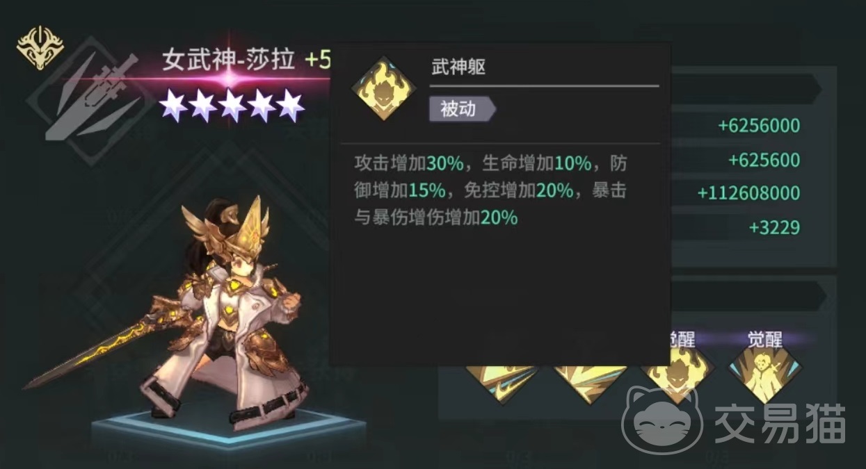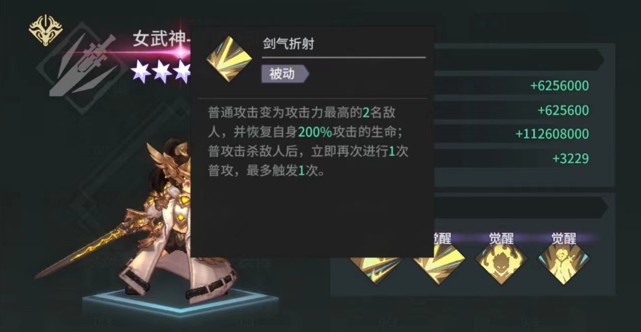自身还有两个非常强势的被动,武神躯和武神觉醒,在战斗之前就可以获得高达30%攻击力增幅,以及10%生命值加成,防御也获得了15%的提升,暴击和爆伤效果都有20%加强。这两个被动所带来的增幅,在当前所有角色中也是最出色的。最后是自身大招武神斩金流,更是所有输出的梦想,该技能使用后对敌人造成高额爆发输出损伤。另外在使用该技能时,在本来就已经很强势的属性基础上再叠加20%伤害。每一次释放都会使接下来的技能伤害提升20%,如果该技能造成击杀,可以再次释放一次。