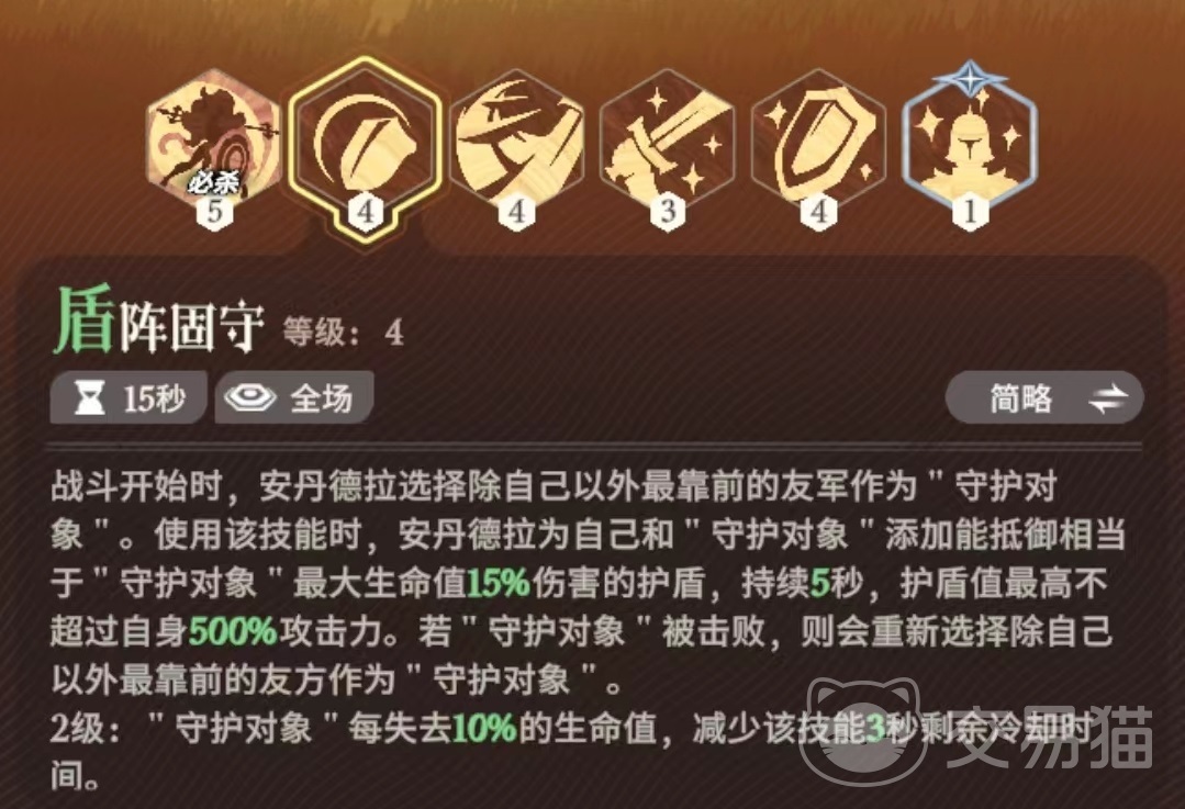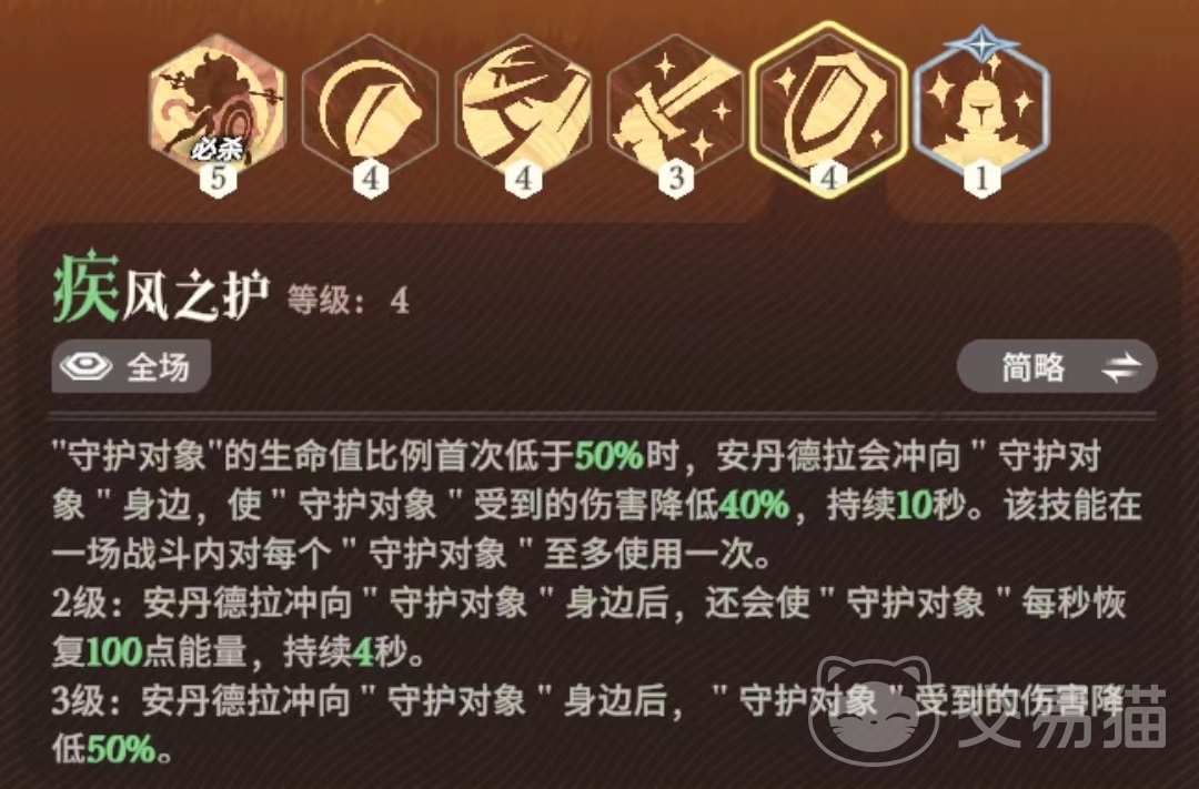英雄的专精使得战斗中自身最大生命值提高最多为29%。还有一个疾风之护,当被守护目标血量低于半血时,流放之矛安丹德拉就会冲向目标,降低对方受到的伤害。最后一个觉醒之力,使用必杀技命中敌人时会额外提升护甲,最多能叠加6次,该效果属于永久提升。