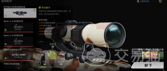 瞄具这个就看个人喜好了。有机械瞄具就用上,光学瞄具的话,四倍镜挺不错的。如果玩家喜欢对枪,HTHEG4倍镜能帮玩家标记敌人,让他们无处可逃。如果玩家更喜欢搜刮物资,THEG4倍镜能透视物资,简直就是个神器。最后就是战术设备和子弹的选择了。TBL镭射加上X1手电,这个组合真的很万能,各种场合都能用。子弹的话5级弹肯定是最好的选择,伤害最大化,让玩家在战场上更有优势。