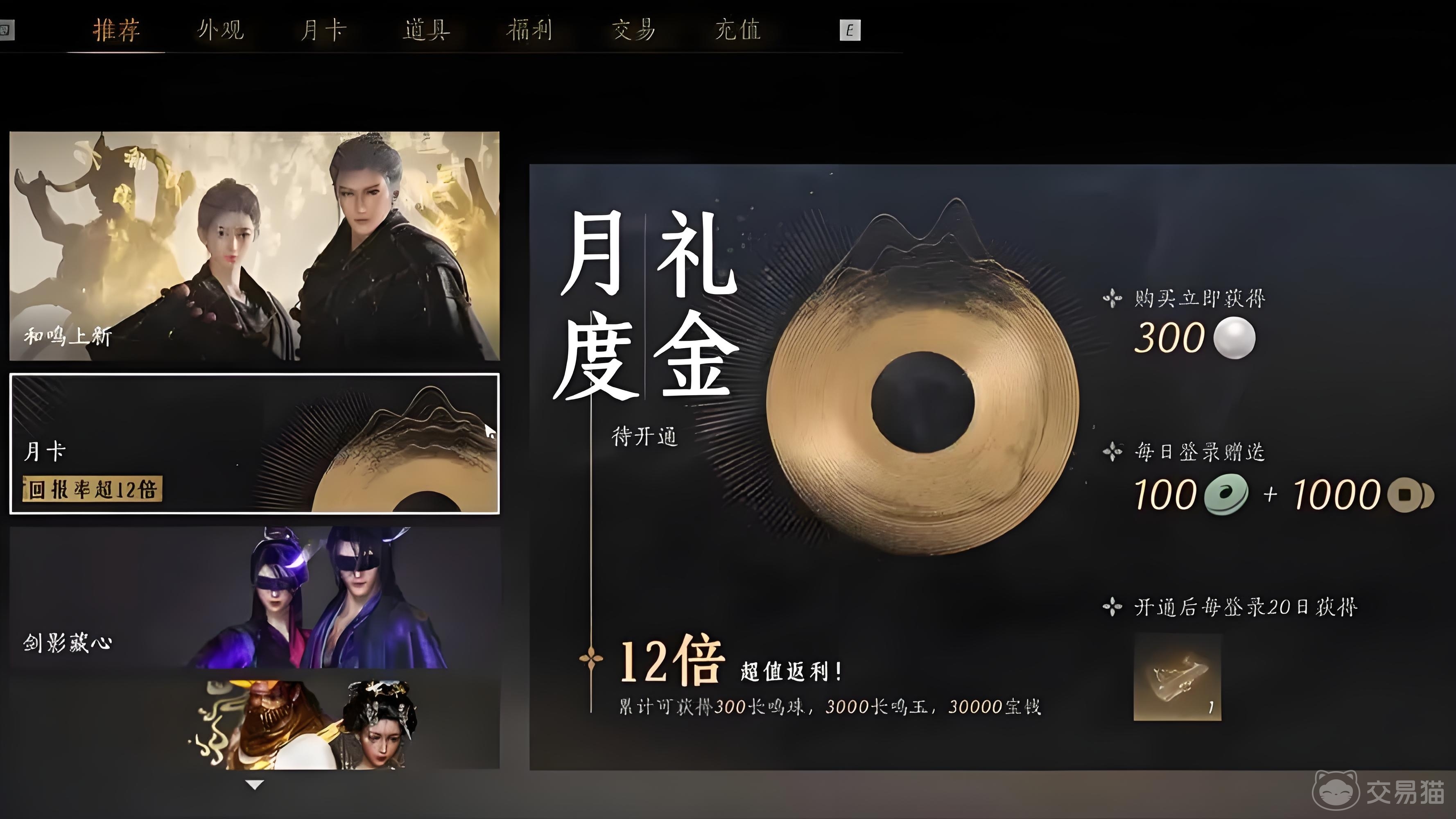 我们就拿剑影藏心这套时装来举个例子,这套时装的价格是2580长鸣珠,而购买时装的长鸣珠就需要我们氪金才能过得了,还有游戏的月卡,每个月需要充值一次,而价格大约在30元左右,充值月卡后除了获得300的长鸣珠,每天上线系统还会自动给月卡玩家赠送一定的长鸣珠和铜钱,累计登陆到指定的日期,系统还会赠送袅袅之音,千万不要小看这张卡片,这张卡片是可以到抽卡池抽取福利的。