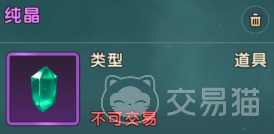 纯晶在游戏内是一个角色道具,属于不可交易的道具之一,它是散发着绿色光芒的纯色水晶,天生没有一点杂质,可以用于天赋的培养,提升自身的天赋水平,也可以用于重置天赋。