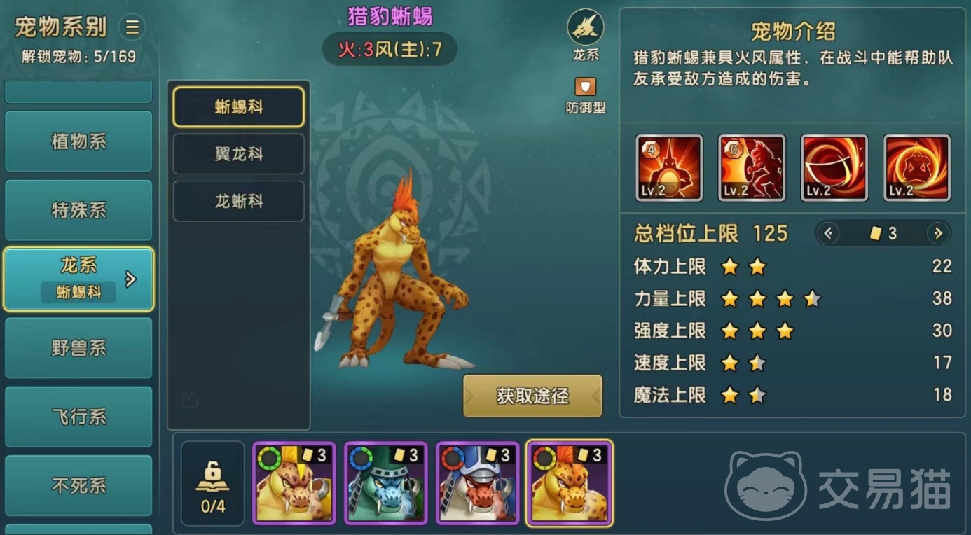 蜥蜴科:蜥蜴战士、蜥蜴斗士、蜥蜴武士、猎豹蜥蜴,这4个宠物之中最值得养成的还当属蜥蜴斗士,它属于一个全面发展的宠物,具备地水属性,在团队作战中可以帮助队友承受敌方所带来的伤害,属于一个前排角色,防御力较强,而且力量上限较高,能够给对手带来压制效果,同时也可以激集火于自身,保证队伍的存活空间。属于一个强大的坦克级角色,培养价值较高,无论是在前期战斗还是后期团战中都能带来比较不错的收益,新手小伙伴是一定要养成的。