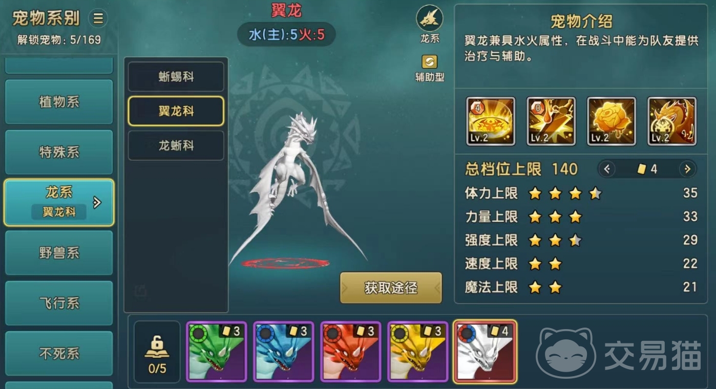 翼龙科:大地翼龙、寒冰翼龙、火焰翼龙、烈风翼龙以及翼龙,这些宠物中最值得养成的还是翼龙,它是游戏内目前为数不多的红色品质宠物,总档位上限高达140,属于一个奶妈型角色,拥有治疗和辅助的效果,在团队作战中可以帮助友方角色恢复血量,同时也能提高他们的攻击实力,先手输出能够让整个队伍的战斗能力大幅度增加。不过唯一可惜的就是这个宠物的获取难度较高,玩家们只能在宠物市场交易获取,或者是通过完成指定任务解锁碎片合成。而且它的培养难度较高,如果是新手的话,不建议去养成,等到玩家实力上去了再慢慢培养也不晚。