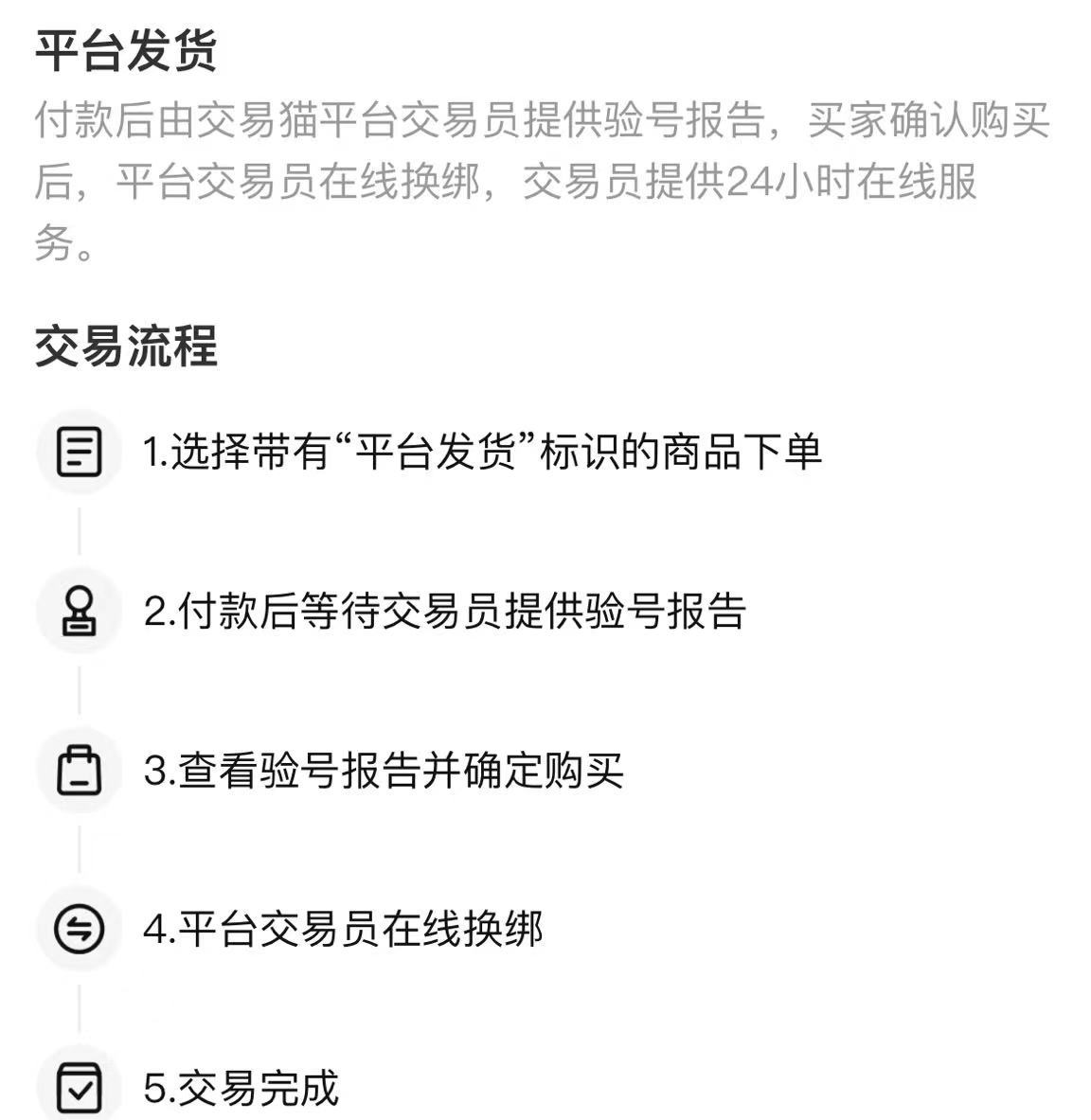 为什么说交易猫靠谱呢?首先平台有非常全面的安全保障机制,从交易环境、交易手续、交易售后各种维度来保证买家的权益。就拿交易手续来说,如果是平台发货的话就能在线换绑资料,把账号资料转移成为买家的,既能避免纠纷又能让买家更放心。