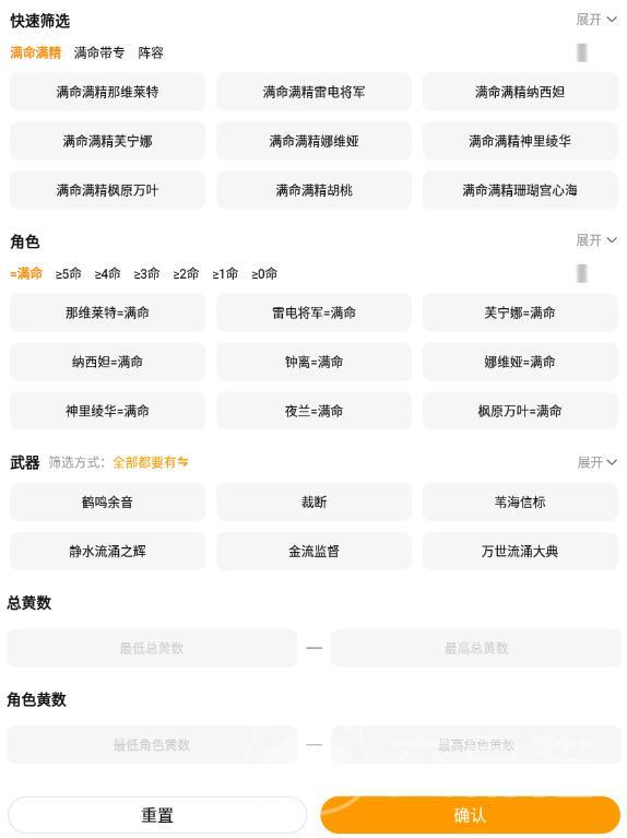 2.为了方便大家去进行账号检索,软件中还专门设计了一个筛选系统,在下拉列表当中会显示多个选项,大家根据自己的需要去挑选后,接着点击确认就能找到许多符合要求的账号了。