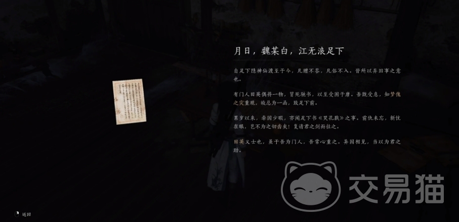 对于改名这个信息,玩家可在剧情故事开始时就能知晓。当主角在剧情中被蒙面人打败并被拿走玉佩后,探索房屋遗迹可发现一份别人写给江无浪的信,从而确定江无浪就是抚养主角长大的江晏。而且在过完无面人剧情后,通过寒姨与他人的对话,也能知道江无浪几年没有回来了,这一点也与江叔(江晏)的离开对得上,所以可以确定江无浪就是江晏。