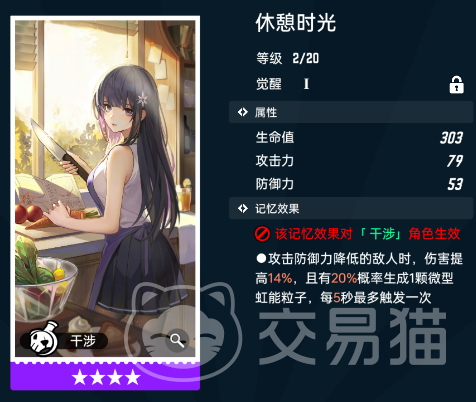 除了奥义技能外,古河诗音的普攻和重击技能也是一大特色。她的普攻技能可以连续对敌人进行三段式攻击,每一段攻击都会造成不同程度的冰属性伤害。而她的重击技能则是一种强力的单体攻击技能,可以对单个敌人造成大量的伤害!古河诗音这个角色自身的生命值比较低,大家可以搭配一些适合的记忆来作为强化基底,这里小编比较推荐各位去选择【休憩时光】,当攻击防御力降低的敌人时,伤害提高14%,且有20%概率生成1颗微型虹能粒子,每5秒最多触发一次!
