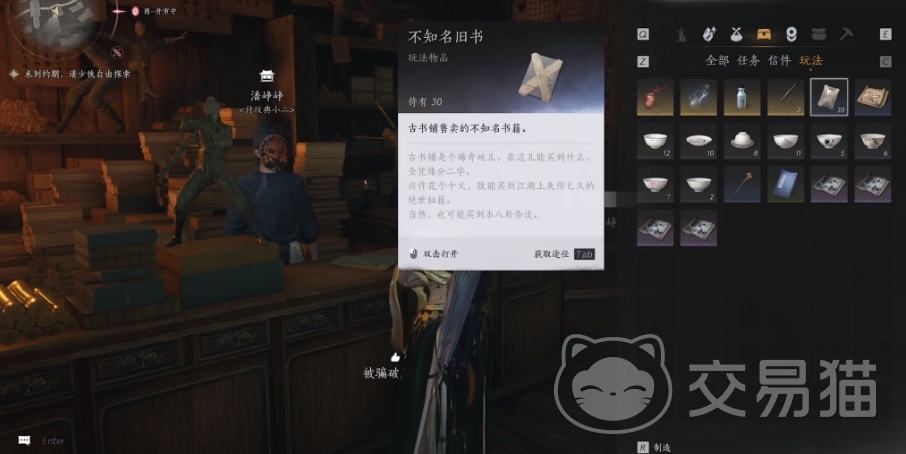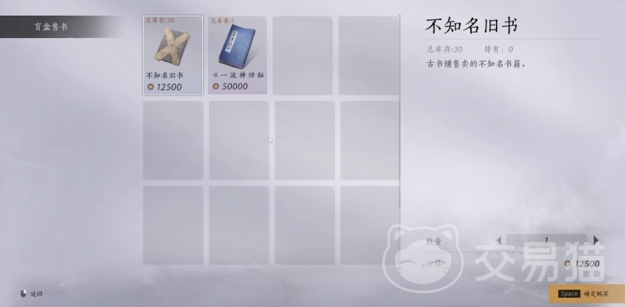 古书商店是采用盲盒售书的方式,里面的书本开出来的东西并不固定,其中不知名旧书便是玩家们的目标,该书每本售价12500,买满30本必然能开出剑气纵横心法,玩家最好一次性将30本全部拿下,避免开不出来后还要再来跑一趟。要是玩家的宝钱数量不足以满下全部,可先去江湖上刷一轮钱,或是在不肝里兑换后,再购买不知名旧书。