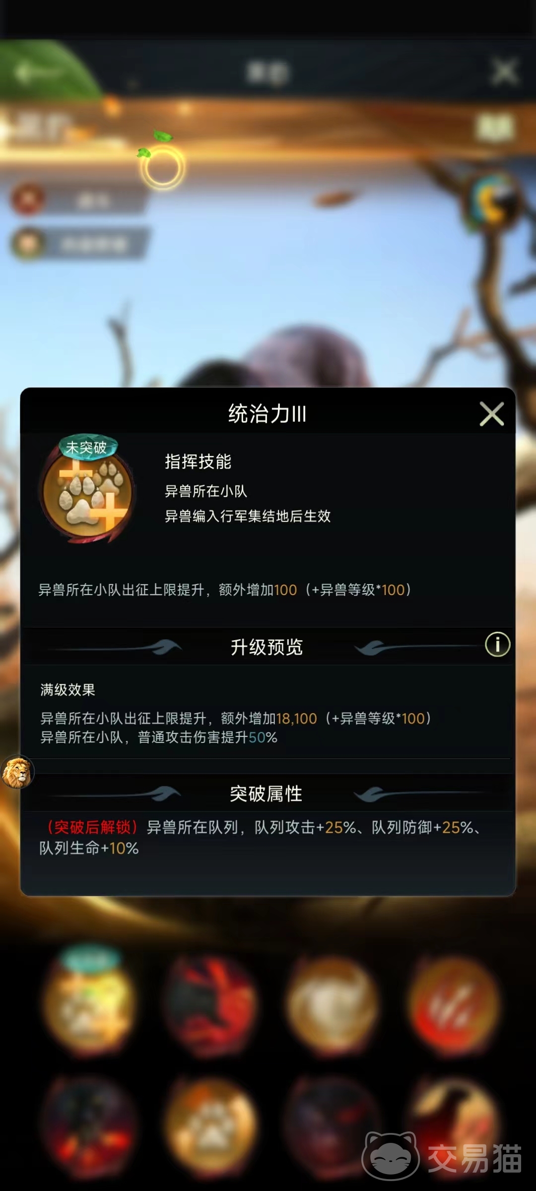 同时,黑豹还具有统治力这一通用属性,相比于其他颜色级别的异兽,黑豹统治力自带级别已经是最高档,在提升异兽小队出征上限的同时还能提升小队整体普通攻击值,高效利用攻击技能冷却时间空隙进行普通攻击,增加总体伤害。
