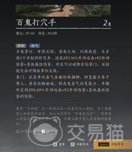 首先是”百鬼打穴手“这一内功,它可以让玩家直接闪现到敌人面前,最多可以同时将五名敌人给定住,并且还可以造成伤害。除此之外,还可以对目标敌人的罩门进行破除,不过如果是对那种boss强敌的话,这个技能就没有用了。