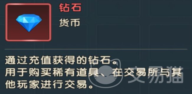 第三个是只能通过充值获得的钻石,钻石可以用来购买一些比较稀有的道具,也可以在交易所中和其他的玩家进行交易。