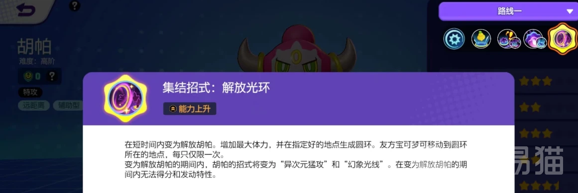 最后得说说胡帕的大招解放光环,用了这个大招,胡帕就能在短时间内变身成解放胡帕,不仅体力上限会增加,还能放出一个圆环。这个圆环可厉害了,队友可以瞬移到圆环的位置,但只能用一次。不过要注意,变身期间胡帕是不能得分和发动特性的,这点得牢记,胡帕的技能都很实用,有控制和伤害,还有辅助,真是个全能的宝可梦。