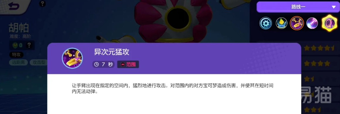 胡帕有个技能叫异次元猛攻,这技能可厉害了,它的手臂能突然出现在某个地方,然后猛地攻击,这样不仅能打到敌人,还能让他们在短时间内动弹不得。接下来是幻象光线这个技能,胡帕会发射出一道横扫的光线去攻击敌人,只要打中了,就能造成伤害。而且,在用这个技能的时候,胡帕是不会被敌人控制的,这样它就能更自由地发动攻击了。