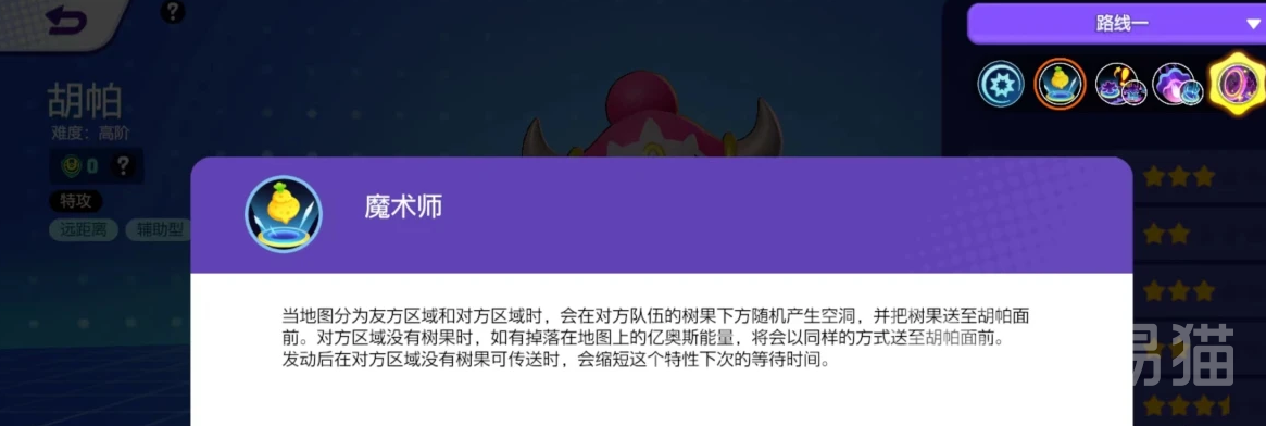 胡帕这个宝可梦普通攻击挺有意思的,我们打上三次之后,它的攻击就会变强,能朝对面的宝可梦发射光线来造成伤害。如果胡帕变身了,那它每次攻击都能打到两个目标,这可真是加倍的厉害。然后说说它的被动技能魔术师,这个技能也挺神奇的,地图上有我们的区域和对方的区域,对方区域里的树果有时候会突然消失,然后出现在胡帕面前,就像是变魔术一样。