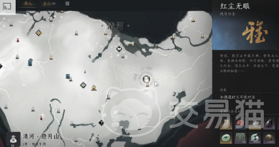 想获得奇术红尘障目玩家需要完成一个简单的任务,我们来到隐月山,到达目的地之后就可以看到一个npc天不收,与其对话就能够接收并触发任务。根据剧情的指引,玩家跳到旁边的湖中。
